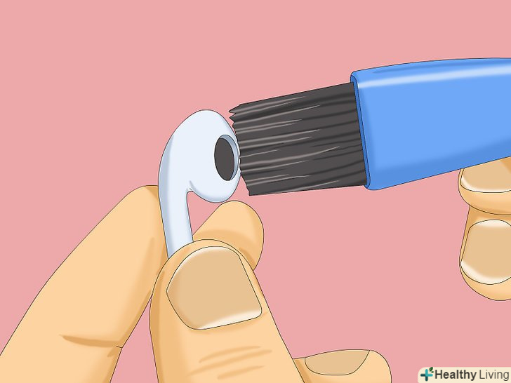 Тепер протріть самі навушники AirPods.обережно витріть по черзі обидва навушника. Якщо бруд набилася в отвори, обережно видаліть її за допомогою щітки. Можна змочити ватяну паличку краплею ізопропілового спирту, щоб вдалися присохлу вушну сірку. Однак будьте обережні-спирт не повинен потрапити в отвори або всередину динаміків.