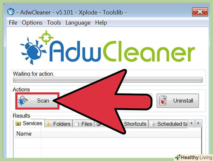 Відкрийте AdwCleaner. натисніть «Scan» (Сканувати), щоб запустити процес сканування комп'ютера на наявність інфекцій. Цей процес може зайняти близько 20 хвилин. Коли сканування завершиться, натисніть «Clean» (Очистити), щоб видалити знайдені інфіковані файли.