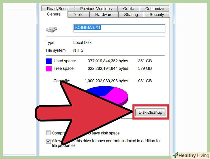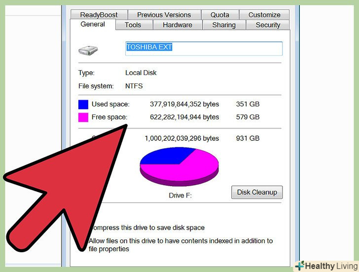 Перевірте вільний обсяг системного диска.як правило, він не робить істотного впливу на продуктивність комп'ютера, але якщо вільний обсяг системного диска опуститься нижче 20%, робота системи трохи сповільниться. Windows використовує вільний обсяг для переміщення і зберігання тимчасових файлів, тому без вільного обсягу швидкодія системи знизиться. Щоб підтримувати продуктивність системи на належному рівні, регулярно видаляйте старі і непотрібні файли.- Відкрийте вікно "Комп'ютер". Натисніть⊞ Win+E і знайдіть системний диск (зазвичай це диск C:). Для забезпечення максимальної продуктивності вільний обсяг цього диска повинен становити не менше 20% від загальної ємності диска.