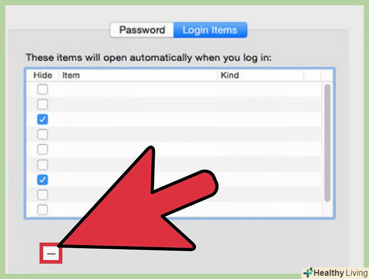 - Виберіть програму, яку ви хочете видалити з автозавантаження, і натисніть– -". Можливо, спочатку вам доведеться натиснути на значок у вигляді замка і ввести пароль адміністратора.
