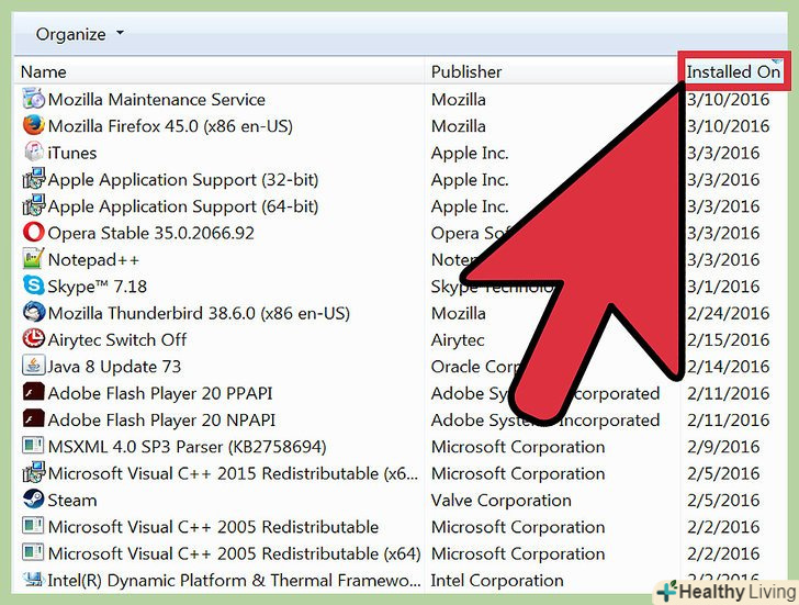 Знайдіть нещодавно встановлені програми, які ви не знаєте.список можна впорядкувати за датою установки, щоб знайти програми, які були встановлені недавно і, можливо, без вашого відома. Перегляньте кожну програму в списку і зверніть увагу на ті, які ви не знаєте. В Інтернеті пошукайте інформацію про кожну невідомої програмі, щоб з'ясувати, чи є вона шкідливою.