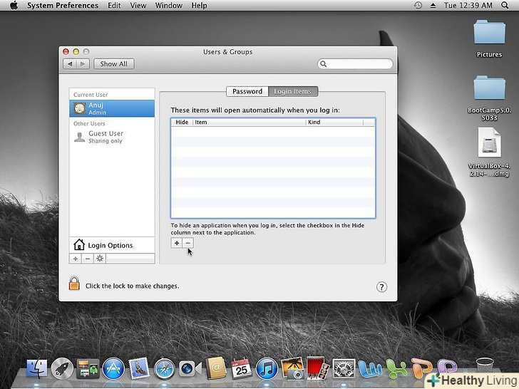 - Перейдіть до меню Apple. Виберіть System Preferences (Системні налаштування) ==gt; Accounts (акаунти), а потім перейдіть на вкладку Login Items (об'єкти входу) для перегляду елементів, які автоматично починають працювати при запуску системи. Часто ці програми навіть не використовуються; вони просто збільшують час завантаження Mac і займають пам'ять.