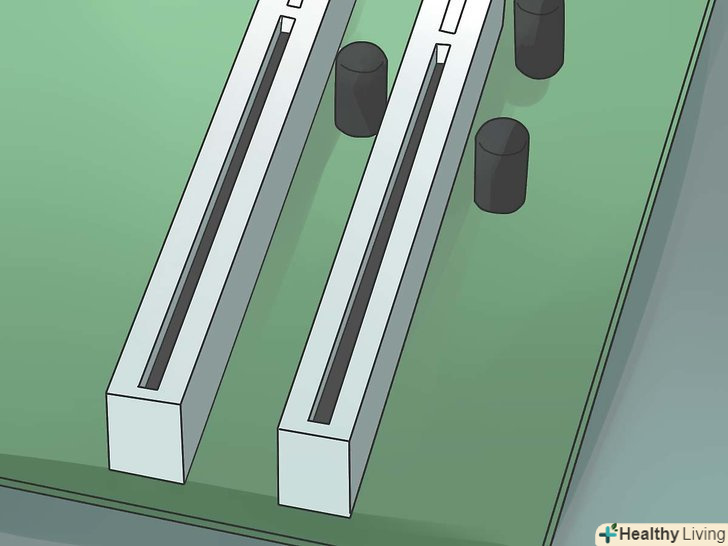 Знайдіть слоти PCI. В них встановлюються додаткові карти. Як правило, таких слотів від одного до п'яти і вони білі. Слоти PCI розташовані навпроти знімних панельок, які знаходяться на задній панелі корпусу.- Якщо вам не вдається знайти слоти PCI, почитайте інструкцію до материнської плати. Її можна знайти в мережі, якщо ви знаєте номер моделі материнської плати.