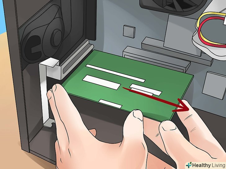Вийміть встановлену звукову карту (при необхідності).якщо ви змінюєте стару карту, спочатку вийміть її. Якщо встановити дві аудіокарти, вони будуть конфліктувати. Відкрутіть гвинт, що фіксує карту, і витягніть карту з слота.- Можливо, вам доведеться відключити звукову карту від оптичного приводу.