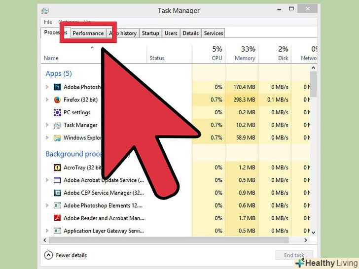 У диспетчері завдань виберіть вкладку "продуктивність".якщо ви використовуєте Windows 8 або вище, то щоб побачити вкладку "продуктивність", вам може знадобитися натиснути кнопку"Детальніше".