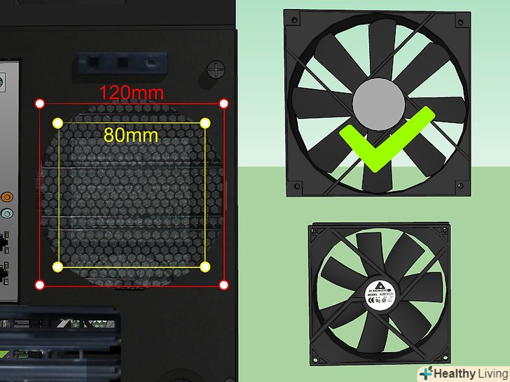 Перевірте специфікації комп'ютерного корпусу.існують два основних розміри комп'ютерних вентиляторів: 80 мм і 120 мм.Корпус може підтримувати і інші розміри, наприклад, 60 мм або 140 мм. якщо ви не впевнені, витягніть один з вентиляторів і візьміть його з собою в магазин комп'ютерної техніки, щоб дізнатися його розмір (або виміряйте розмір самостійно).- Сьогодні в більшості випадків використовуються 120 мм вентилятори.