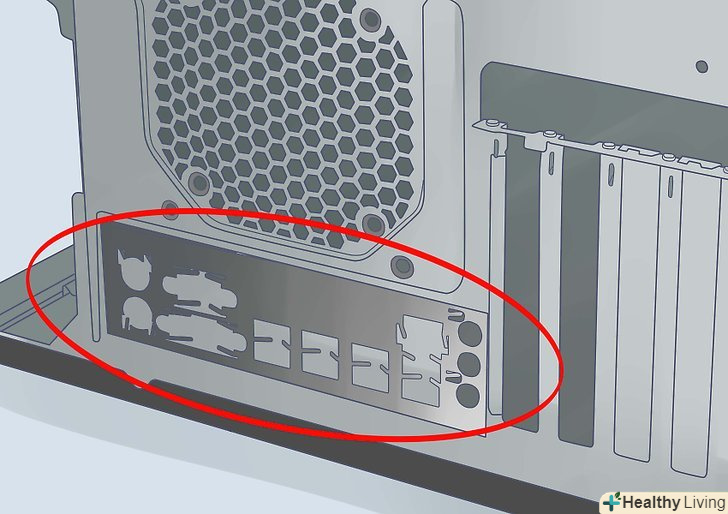 Замініть панель роз'ємів.ця панель знаходиться ззаду корпусу, звідки виходять роз'єми до Вашого монітора, різних USB-приладами та інших периферійних пристроїв. Швидше за все, у вас вже буде встановлена стандартна панель, яку доведеться замінити на нову, що йде разом з материнською платою.[1]- Натисніть на всі чотири кути панелі, щоб закріпити її в корпусі. Вона повинна замкнутися на своєму місці.