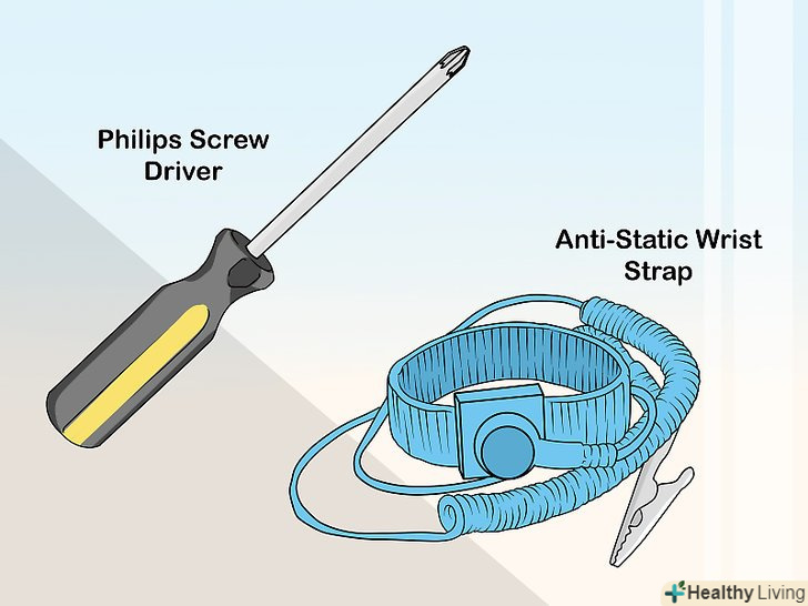 - Щоб працювати з комп'ютерними комплектуючими, потрібен антистатичний браслет, який дозволяє позбутися від електричних зарядів на тілі людини. Якщо у вас немає такого браслета, просто доторкніться до корпусу комп'ютера або будь-якого металевого предмету, щоб нейтралізувати електричні заряди. Але все ж рекомендується надіти антистатичний браслет.[5]