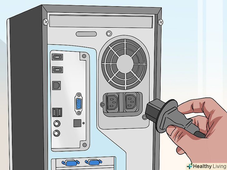 - Тепер підключіть Стабілізатор напруги до електророзетки. Якщо стабілізатора напруги немає, підключіть комп'ютер безпосередньо до електророзетки; але це найгірший варіант, так як скачки напруги можуть завдати шкоди комп'ютерним комплектуючим.[22]