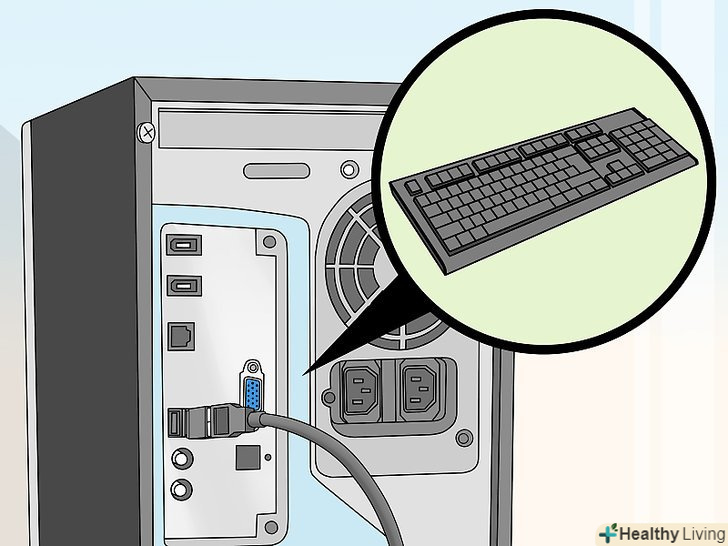 - Клавіатура може підключатися за допомогою PS / 2-штекера круглої форми. У цьому випадку підключіть клавіатуру до відповідного (фіолетового) PS/2-роз'єму на задній панелі комп'ютера.[17]