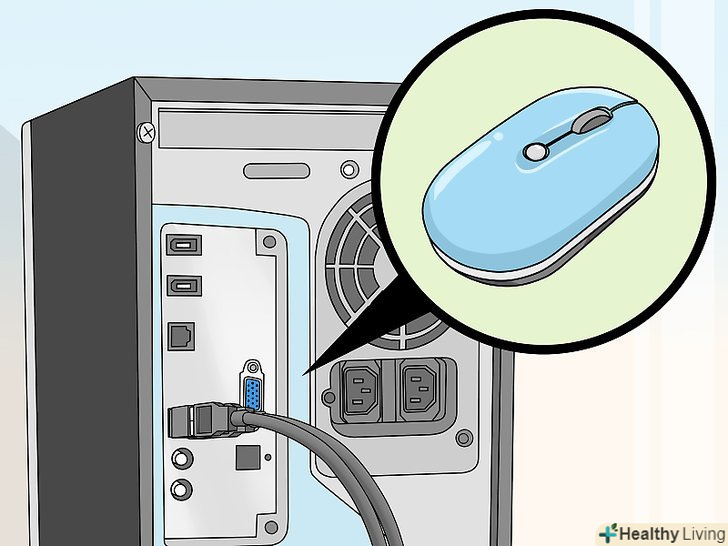 Підключіть мишу. Тепер підключіть мишу. Швидше за все, миша упакована в пластиковий пакет – позбудьтеся від нього. Миша підключається до комп'ютера за допомогою PS/2-штекера або USB-штекера. У цьому випадку підключіть мишу до будь-якого USB-порту або відповідного (зеленого) PS / 2-роз'єму на задній панелі комп'ютера.[18]