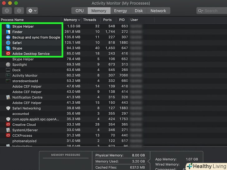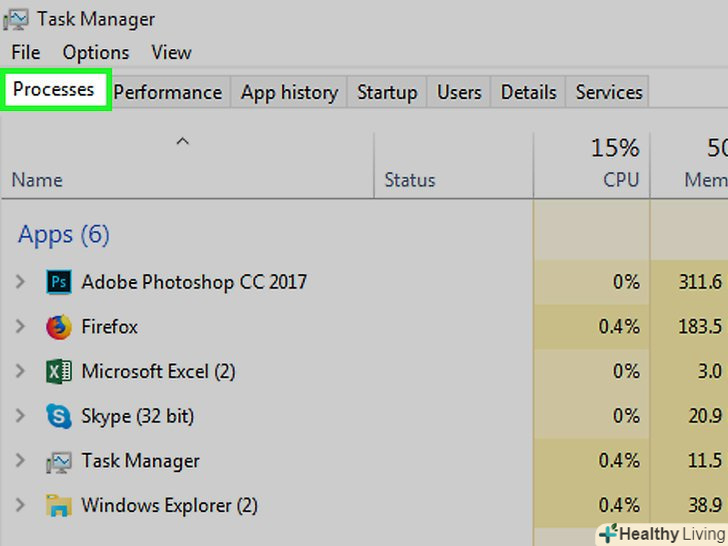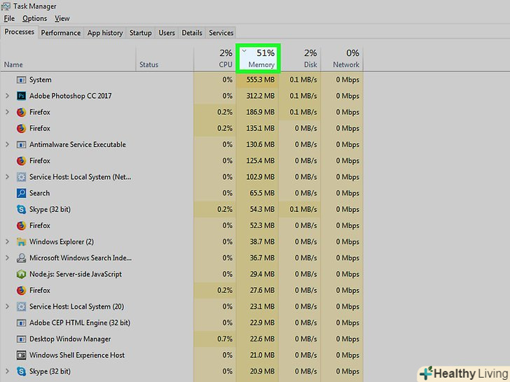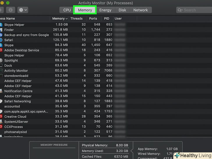 Клацніть по вкладціПам'ять.вона знаходиться у верхній частині вікна. Відобразиться список всіх запущених програм і процесів, починаючи з тих, які займають більший обсяг оперативної пам'яті.[3]