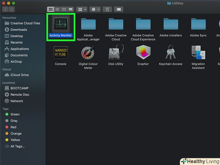 Запустіть утиліту "моніторинг активності".двічі клацніть по значку у вигляді зеленої ламаної лінії на чорному тлі.- Можливо, вам доведеться прокрутити вниз, щоб побачити цю опцію.