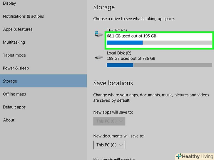 З'ясуйте обсяг вільного простору.у верхній частині сторінки відобразиться індикатор, де зліва вказано обсяг зайнятого простору, а праворуч — вільного простору. Якщо жорсткий диск практично заповнений, швидкодія комп'ютера знизиться.- Щоб звільнити місце на жорсткому диску, перемістіть або видаліть програми та / або файли.
