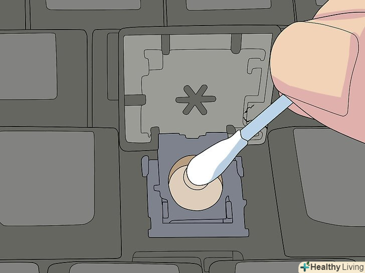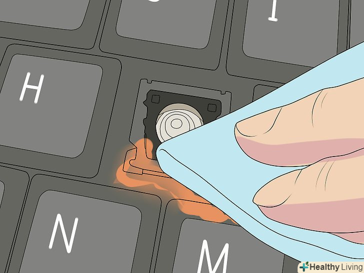 Витріть розливи.якщо ви щось розливали на клавіатуру, тоді витріть розлив тканиною без ворсу. Змочіть тканину в невеликій кількості спирту і акуратно протріть клавіатуру. Не повертайте клавіші на місце, поки спирт повністю не вивітриться, а клавіатура не висохне.
