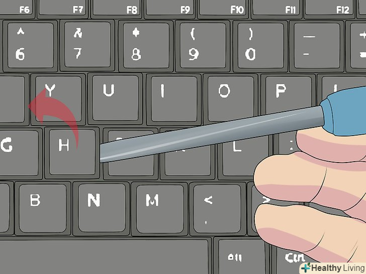 Підніміть клавішу викруткою.вийміть застряглу клавішу невеликою викруткою з плоскою головкою. Почніть з того, що підніміть кожен кут клавіші. Прислухайтеся до звуку клацання, який свідчить про те, що клавіша відчепилася від клавіатури. Повторіть те ж саме з кожним кутом, поки повністю не витягніть клавішу з клавіатури. Ви почуєте два клацання.[2]- Не прикладайте надмірних зусиль. Якщо клавіша не від'єднується, спробуйте підняти інший кут.
