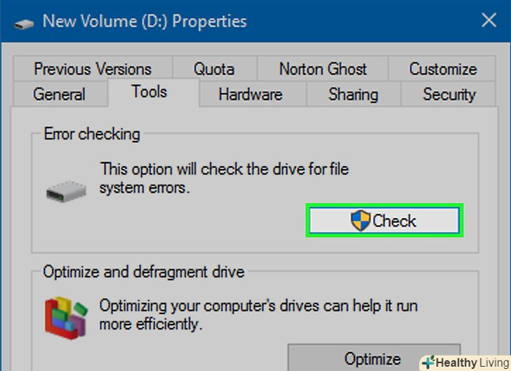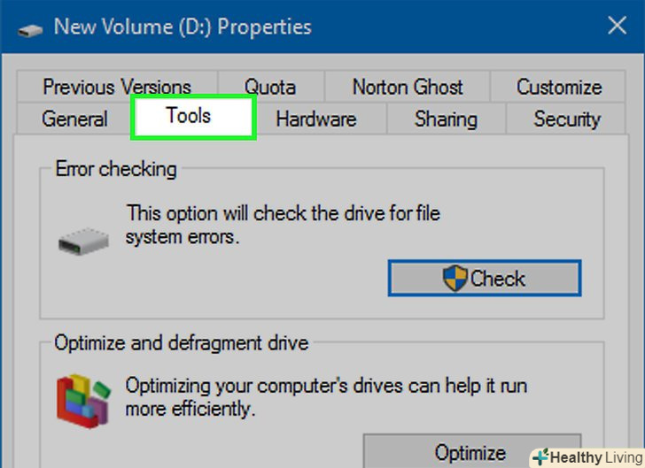 НатиснітьВластивості. ви знайдете цей значок у вигляді білого квадрата з червоною галочкою в лівій частині панелі інструментів "Комп'ютер". Відкриється вікно з властивостями обраного жорсткого диска.
