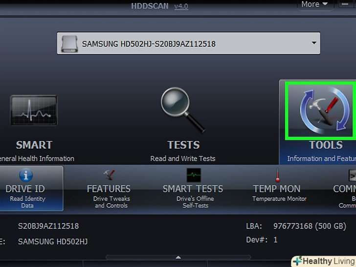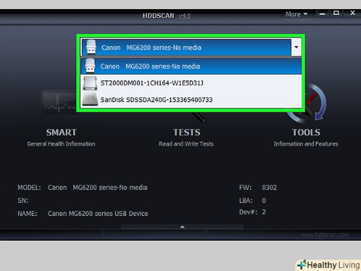 Виберіть свій жорсткий диск.відкрийте меню у верхній частині вікна, а потім в меню клацніть по імені свого жорсткого диска.- За замовчуванням HDDScan працює з внутрішнім жорстким диском комп'ютера, тому в меню виберіть ім'я підключеного (зовнішнього) жорсткого диска.