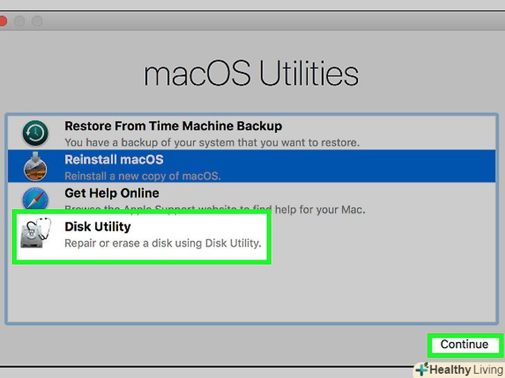Запустіть дискову утиліту.натисніть "Дискова утиліта «у вікні» відновлення«, а потім натисніть» Продовжити" в нижньому правому куті вікна.