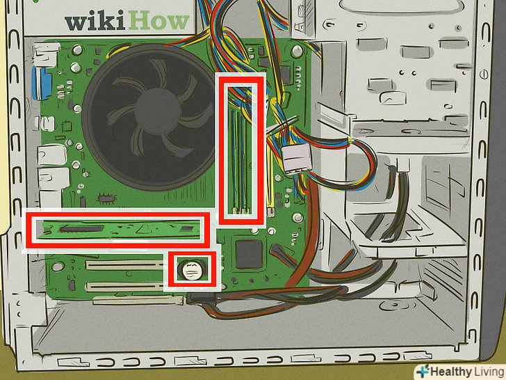 Вийміть, а потім знову встановіть комплектуючі комп'ютера.- Вийміть карту пам'яті, відеокарту і від'єднайте дроти, підключені до контактів процесора.