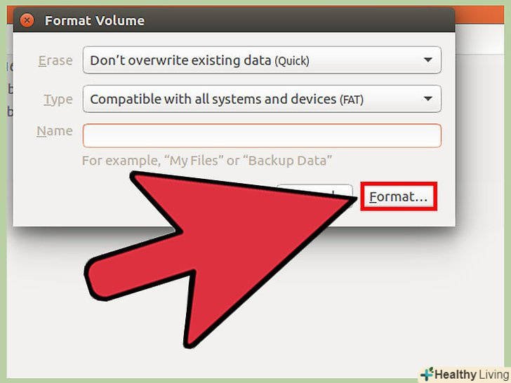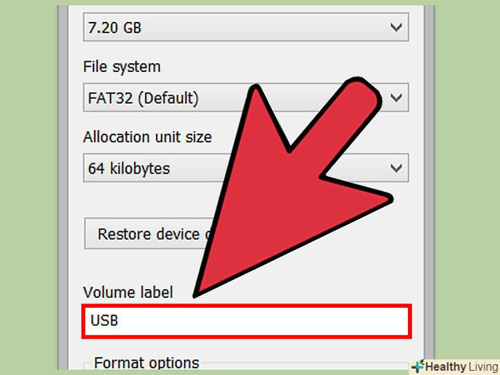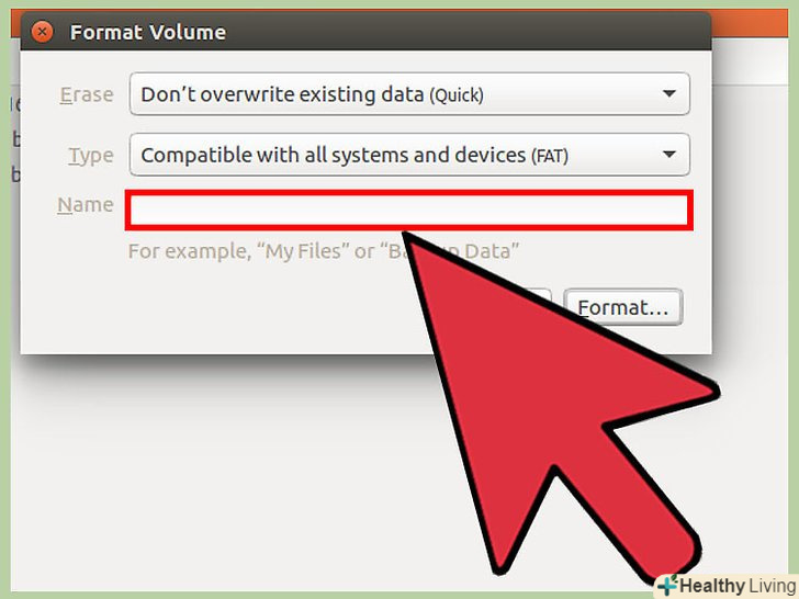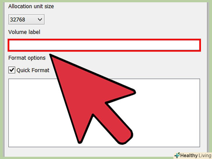Дайте накопичувачу назву. в поле "Volume label" (мітка томи) можна ввести будь-яке ім'я. Воно буде відображатися в пристроях, до яких буде підключатися накопичувач.