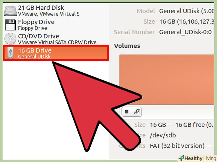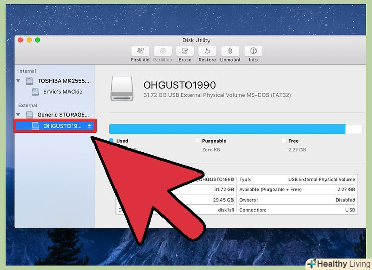 Виберіть ваш USB-накопичувач у списку ліворуч.якщо там вашого накопичувача не виявилося, спробуйте вставити його в інший порт USB. Якщо ви перепробували всі порти, а накопичувач так і не з'явився, то, швидше за все, він несправний.