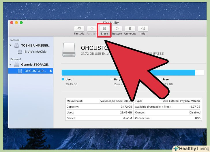 Виберіть ваш USB-накопичувач у списку ліворуч.у лівій частині вікна знаходиться список всіх підключених запам'ятовуючих пристроїв.