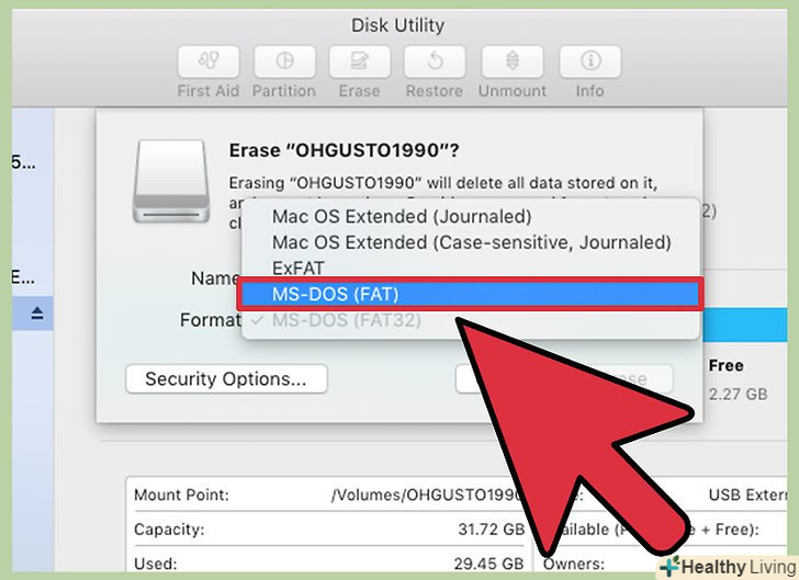 У меню "Формат" виберіть " MS-DOS (FAT)". Тут під" FAT "мається на увазі саме"FAT32". Пам'ятайте, що файлова система FAT32 має обмеження: 32гб — максимальний розмір розділу, 4ГБ-максимальний розмір файлу. Якщо у вас накопичувач більшого обсягу, або якщо необхідно зберігати файли розміром більше 4ГБ, то варто вибрати інший, більш сучасний формат файлової системи, наприклад, exFAT. Якщо накопичувач буде використовуватися тільки на комп'ютерах Mac, то виберіть "Mac OS Extended (журнальний)".[1]- Якщо ваш накопичувач об'ємом більше 32ГБ, але вам необхідна саме FAT32, то можна розбити його на кілька розділів і відформатувати кожен в FAT32. Виберіть вкладку "розділ диска" і натисніть " + " для створення нового розділу. Розбийте простір на частини розміром до 32Гб і виберіть для кожної формат "MS-DOS (FAT)".