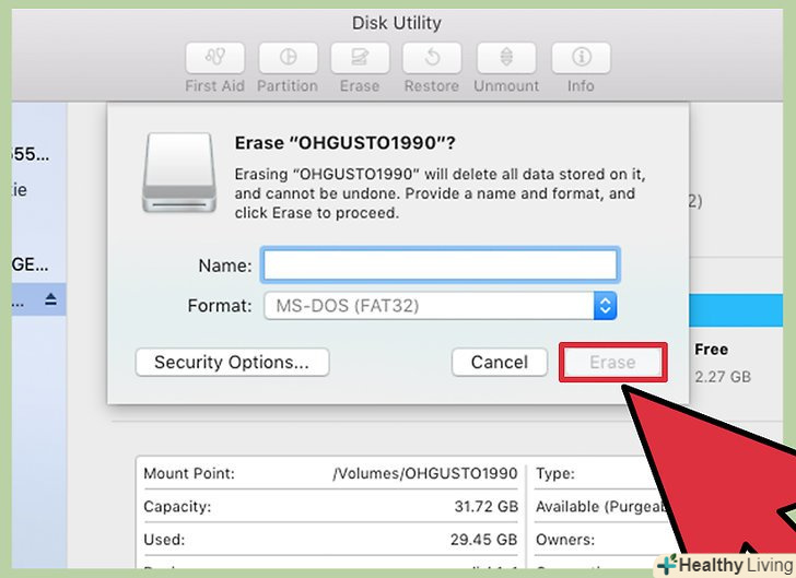 Натисніть "Стерти" для початку процесу форматування.всі дані, які зберігалися на накопичувачі, будуть видалені, а файлова система буде відформатована в FAT32.