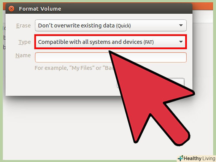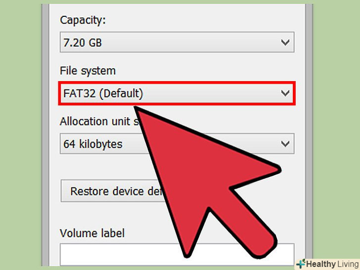 Виберіть " FAT32 "в меню"файлова система". Існує кілька варіантів вибору. Якщо обсяг вашого накопичувача становить більше 32ГБ, або якщо ви бажаєте записувати на нього файли розмір більше 4ГБ, то в такому випадку варто вибрати "exFAT" замість "FAT32". Файлова система exFAT сумісна з більшістю сучасних пристроїв і може використовуватися на накопичувачах будь-яких розмірів, дозволяючи при цьому зберігати файли будь-яких розмірів.- Якщо обсяг вашого накопичувача більше 32ГБ, але ви все одно хочете відформатувати його в FAT32, перейдіть до читання наступного розділу.