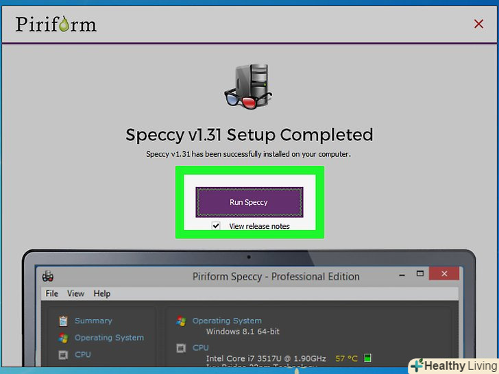 Клацніть поRun Speccy (запустити), коли з'явиться запит. це пурпурна кнопка посередині вікна установника. Запуститься програма Speccy.- Якщо ви не хочете переглянути онлайн-інформацію про Speccy, спочатку зніміть прапорець у " View release notes "(переглянути інформацію про реліз) під кнопкою «запустити».