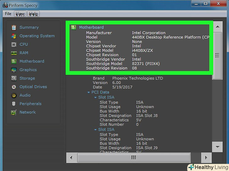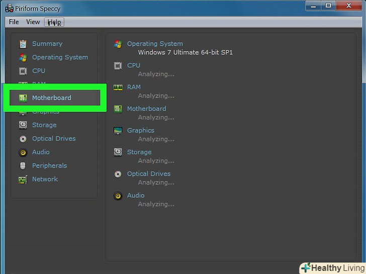 НатиснітьMotherboard (материнська плата).ця вкладка знаходиться в лівій частині вікна Speccy.
