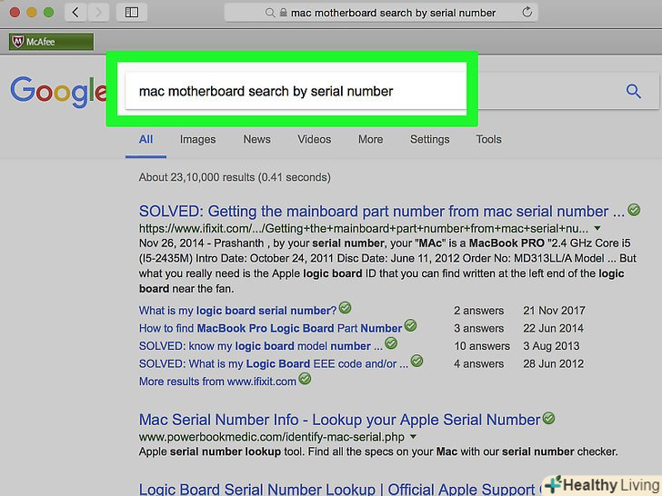 Знайдіть модель материнської плати.відкрийте пошукову систему (наприклад, Яндекс або Google), введіть серійний номер комп'ютера, потім введіть слова «материнська плата» (без лапок) і натисніть ⏎return. Пошукова система видасть список відповідних моделей материнських плат.