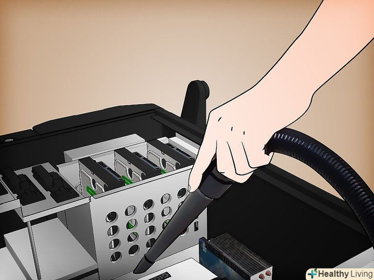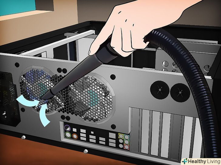 Пил накопичується всередині корпусу шарами, тому включіть пилосос і видаліть великі скупчення пилу, наприклад, на дні корпусу.[1]- Не чистіть пилососом компоненти комп'ютера! Також будьте обережні і не зачепіть компоненти трубками пилососа, щоб не пошкодити їх.
