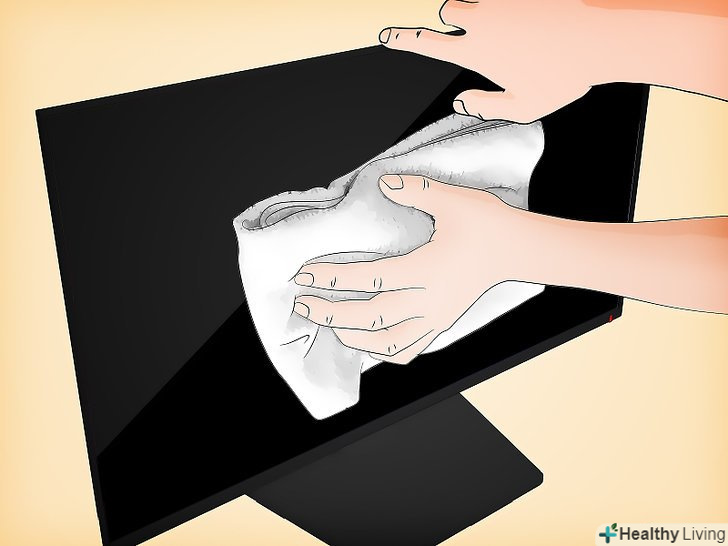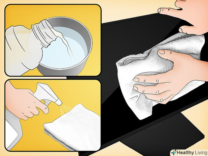 Зробіть миючий розчин.ви можете придбати спеціальні засоби для чищення монітора або зробити їх вдома, змішавши дистильовану воду і оцет в пропорції 50/50. Змочіть тканину в розчині, добре відіжміть її і протріть екран монітора.[4]- Не розпилюйте/бризкайте чистячий розчин безпосередньо на екран, так як рідина може просочитися всередину корпусу монітора і пошкодити його.