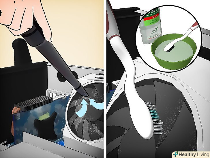 Очистіть кулери пилососом.потім умочіть зубну щітку в спирт і акуратно видаліть пил, що залишився на лопатях кулера.- Кулери рекомендується зняти перед їх чищенням. Для цього вимкніть кабель живлення кулера, а потім відкрутіть гвинти, якими кулер кріпиться до плати. Обов'язково запам'ятайте роз'єм, до якого підключається кабель живлення кулера.