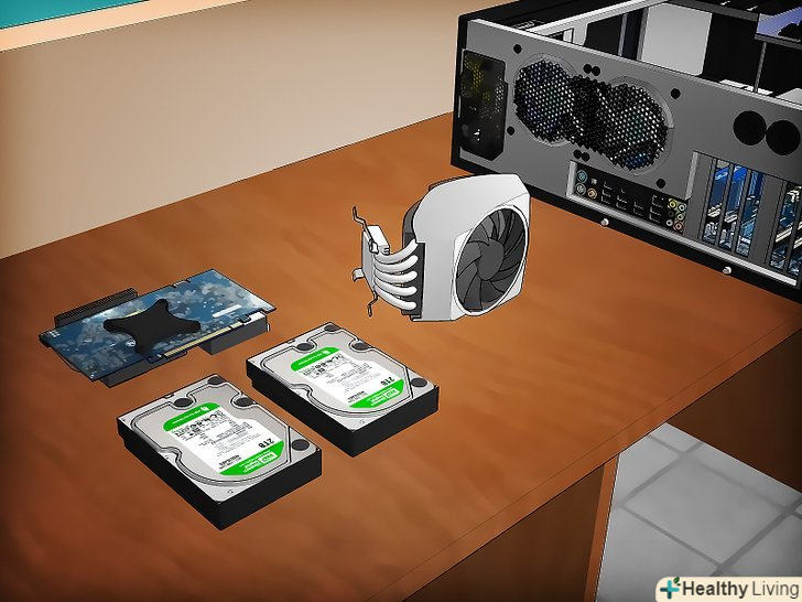 Витягніть компоненти для ретельного чищення. пилосос і вакуум видалять пил з корпусу комп'ютера, але вам необхідно також видалити пил з кожного компонента комп'ютера. Перед відключенням компонентів заземліться. Витягнуті компоненти покладіть на антистатичну поверхню, наприклад, на дерев'яну або гумову основу.[2]- Відключення відеокарти. Відкрутіть гвинти, які фіксують її до корпусу комп'ютера; відсуньте засувку на роз'ємі материнської плати; обережно потягніть карту вгору (можливо, вам знадобиться відключити кабель живлення карти, якщо він є). Покладіть відеокарту на стіл і видаліть з нею пил за допомогою кисті і спирту.