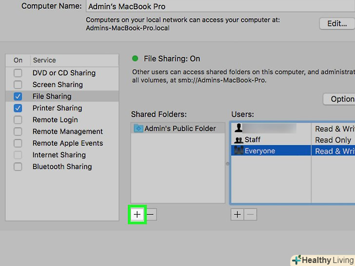 Створіть спільну папку на комп'ютері Mac. натисніть на значок " + " під списком загальних папок, а потім двічі клацніть по потрібній папці.- Можливо, вам доведеться натиснути "Додати", щоб додати папку до списку загальних папок.