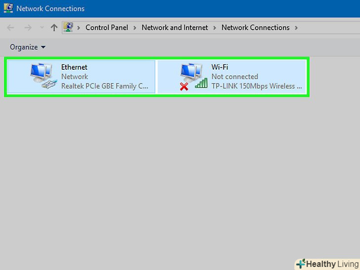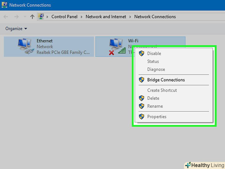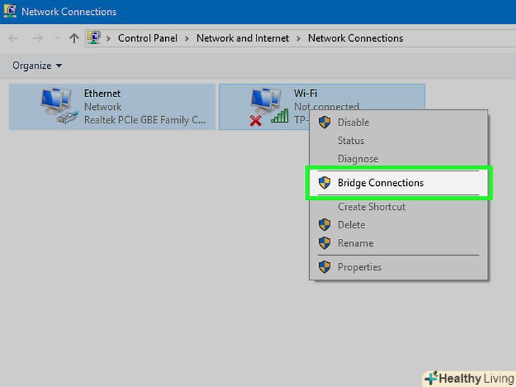 Виберіть бездротове з'єднання та Ethernet-з'єднання. натисніть на значок у вигляді комп'ютера зі словами «підключення по бездротовій мережі», а потім утримуйте клавішу Ctrl і клацніть по значку у вигляді комп'ютера зі словами «підключення по локальній мережі».
