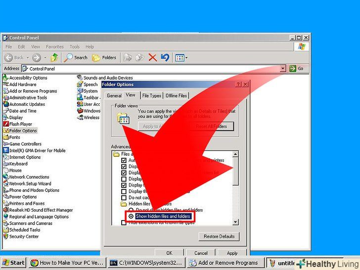 Перед наступним кроком відобразіть приховані файли і папки.для цього натисніть "Пуск» - «Панель управління» - "Параметри папок". Перейдіть на вкладку "Вид «і відзначте»Показувати приховані файли, папки і диски".