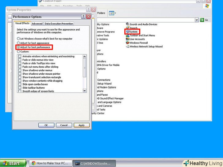 Клацніть правою кнопкою миші по значку "Комп'ютер «і виберіть»Властивості".у вікні, натисніть "Додаткові параметри системи". У розділі «Швидкодія» натисніть "Параметри". На вкладці "візуальні ефекти «відзначте»забезпечити найкращу швидкодію". Це погіршить візуальну привабливість Windows, але підвищить швидкодію системи.