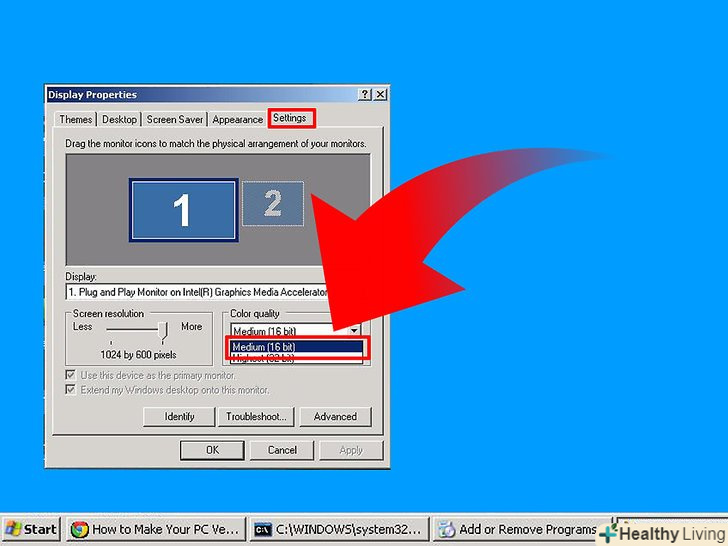 Клацніть правою кнопкою миші по робочому столу, Виберіть " дозвіл екрану«, потім натисніть» Додаткові параметри«, перейдіть на вкладку» монітор«, і в розділі» якість передачі кольору «виберіть»High color (16 біт)".