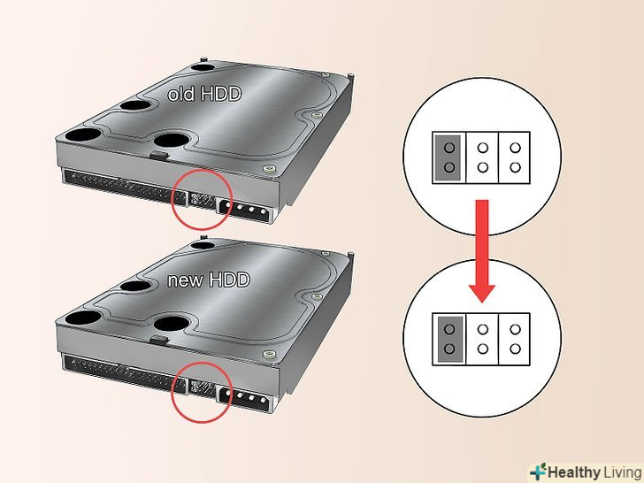Встановіть перемички на IDE-диску.якщо ви використовуєте диск SATA, цей крок можна пропустити. Після того, як ви витягнете жорсткий диск, подивіться на розташування перемичок на самому диску. Якщо ви не знаєте, де вони знаходяться, погляньте на наклейку на жорсткому диску, де показана схема, що ілюструє розташування перемичок. Від положення перемичок залежить роль приводу на каналі: він може бути провідним (Mater), веденим (Slave) або визначатися автоматично (Cable Select). Продублюйте положення перемичок на новому диску.