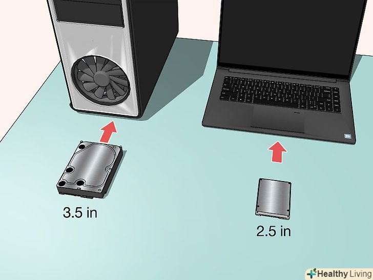 Виберіть правильний диск для свого комп'ютера.у ноутбуках зазвичай використовуються 2,5-дюймові жорсткі диски, тоді як настільні комп'ютери підтримують і 3,5-дюймові диски. Для 2,5-дюймових дисків доступні спеціальні перехідники, тому вони підходять і для настільних комп'ютерів. Більшість SSD-накопичувачів мають розмір 2,5 дюйма, тому багато сучасних виробників почали додавати в нові моделі відсіки для дисків меншого розміру. Якщо ви встановлюєте диск меншого розміру в настільний комп'ютер, в якому немає відсіку на 2,5 дюйма, вам знадобиться перехідник. Жорсткі диски можна купити і в тому, і в іншому розмірі.- SSD, як і HDD, зазвичай підключаються до материнської плати за допомогою роз'ємів SATA. У старих жорстких дисках може використовуватися IDE-шлейф, але їх вже рідко де можна зустріти. SATA зазвичай має три різні версії (SATA, SATA II і SATA III), тому вам необхідно з'ясувати, яку саме з них підтримує ваша материнська плата.