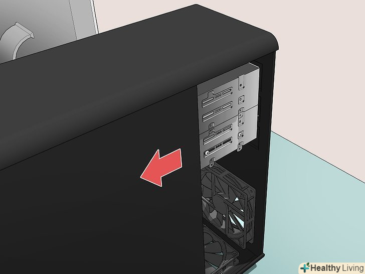 - У деяких системних блоках гвинти не використовуються. Якщо на корпусі немає гвинтів, пошукайте засувку або кнопку, яка дозволяє відкрити бічні дверки або панелі. Зніміть дверцята або панелі, якщо вони будуть заважати.