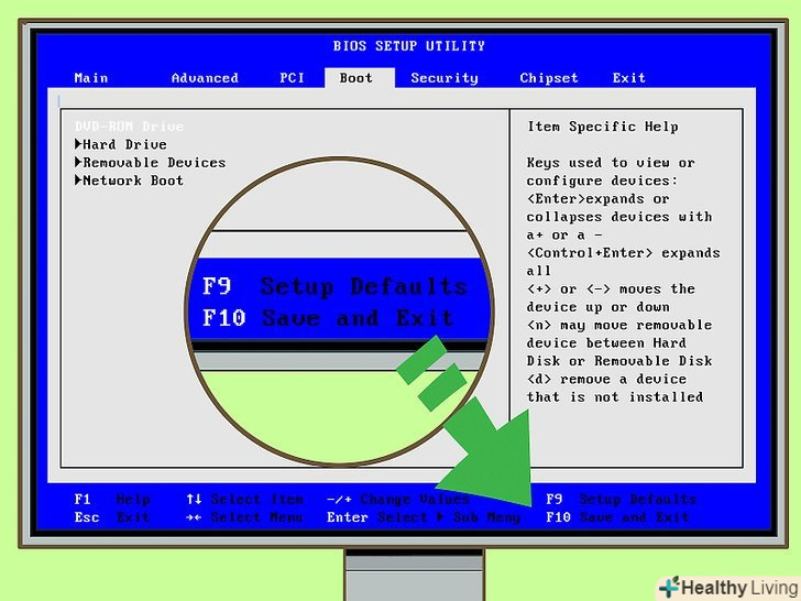 Збережіть зміни і вийдіть з BIOS.для цього потрібно натиснути відповідну клавішу; подивіться на список клавіш і їх функціональність, щоб з'ясувати, яку клавішу потрібно натиснути.- На деяких комп'ютерах вам доведеться натиснути додаткову клавішу (коли з'явиться запит), щоб підтвердити свої дії.