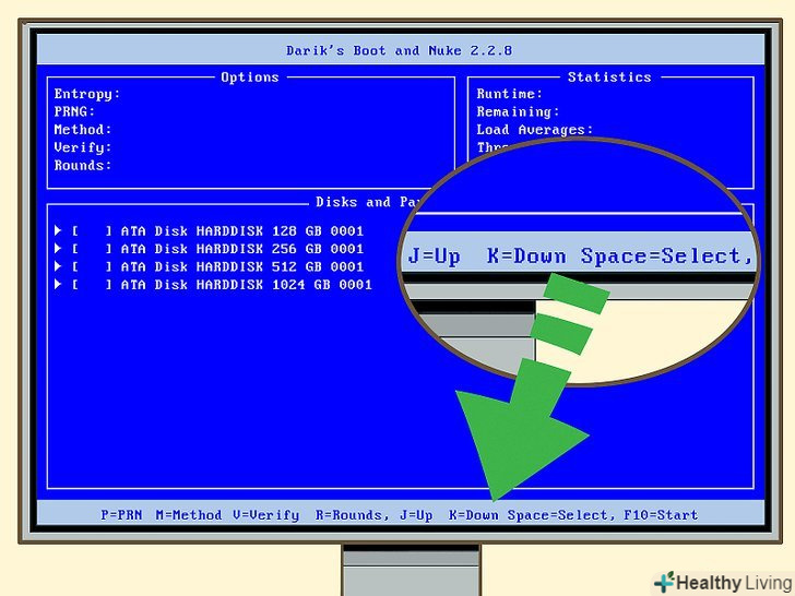 Виберіть жорсткий диск комп'ютера. натисніть клавішу J або K, щоб перемістити маркер вгору або вниз, а потім натисніть Space, коли маркер виділить жорсткий диск комп'ютера.- Зверніть увагу на список клавіш і їх функціональність в нижній частині екрана, щоб з'ясувати, які клавіші служать для навігації і вибору.