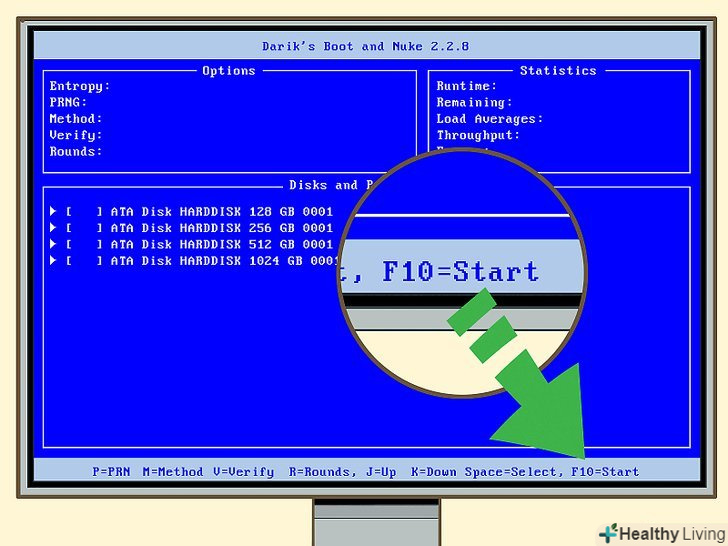 Зітріть інформацію з жорсткого диска. для цього натисніть F10 (або клавішу, зазначену в списку клавіш).[1]- Процес видалення даних може зайняти кілька годин, тому підключіть комп'ютер до надійного джерела живлення.