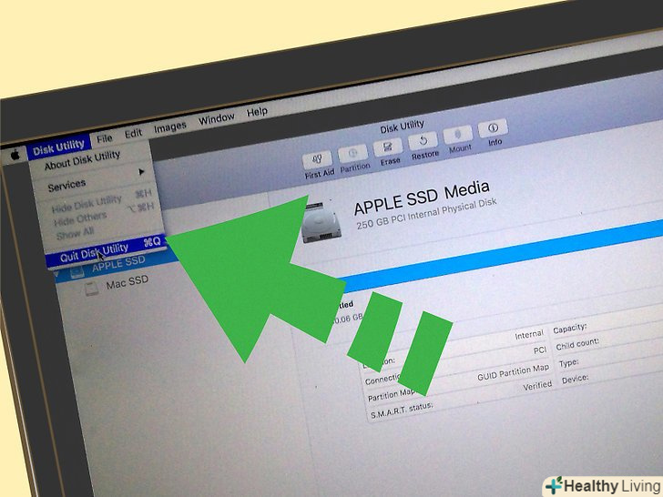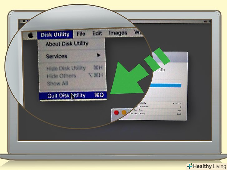 Закрийте вікно дискової утиліти. натисніть Дискова утиліта у верхньому лівому куті екрану, а потім натисніть «вийти» в випадаючому меню. Ви повернетеся на сторінку "утиліти".
