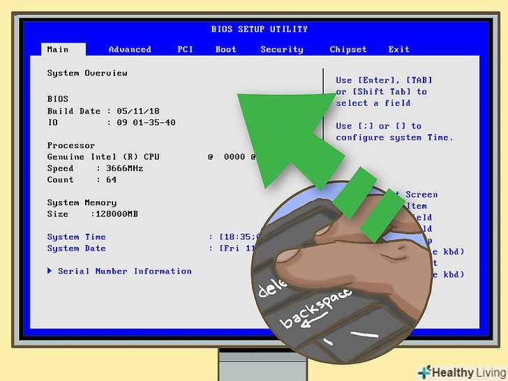 Увійдіть в BIOS.як тільки ви натиснете на» перезавантаження", кілька разів натисніть на клавішу для входу в BIOS. Як правило, такий клавішею є Del або одна з F-клавіш (наприклад, F2); щоб з'ясувати, яку клавішу натискати, почитайте інструкцію (на папері або онлайн) до комп'ютера або материнської плати.- Якщо ви не встигли увійти в BIOS, ще раз перезавантажте комп'ютер і повторіть спробу.